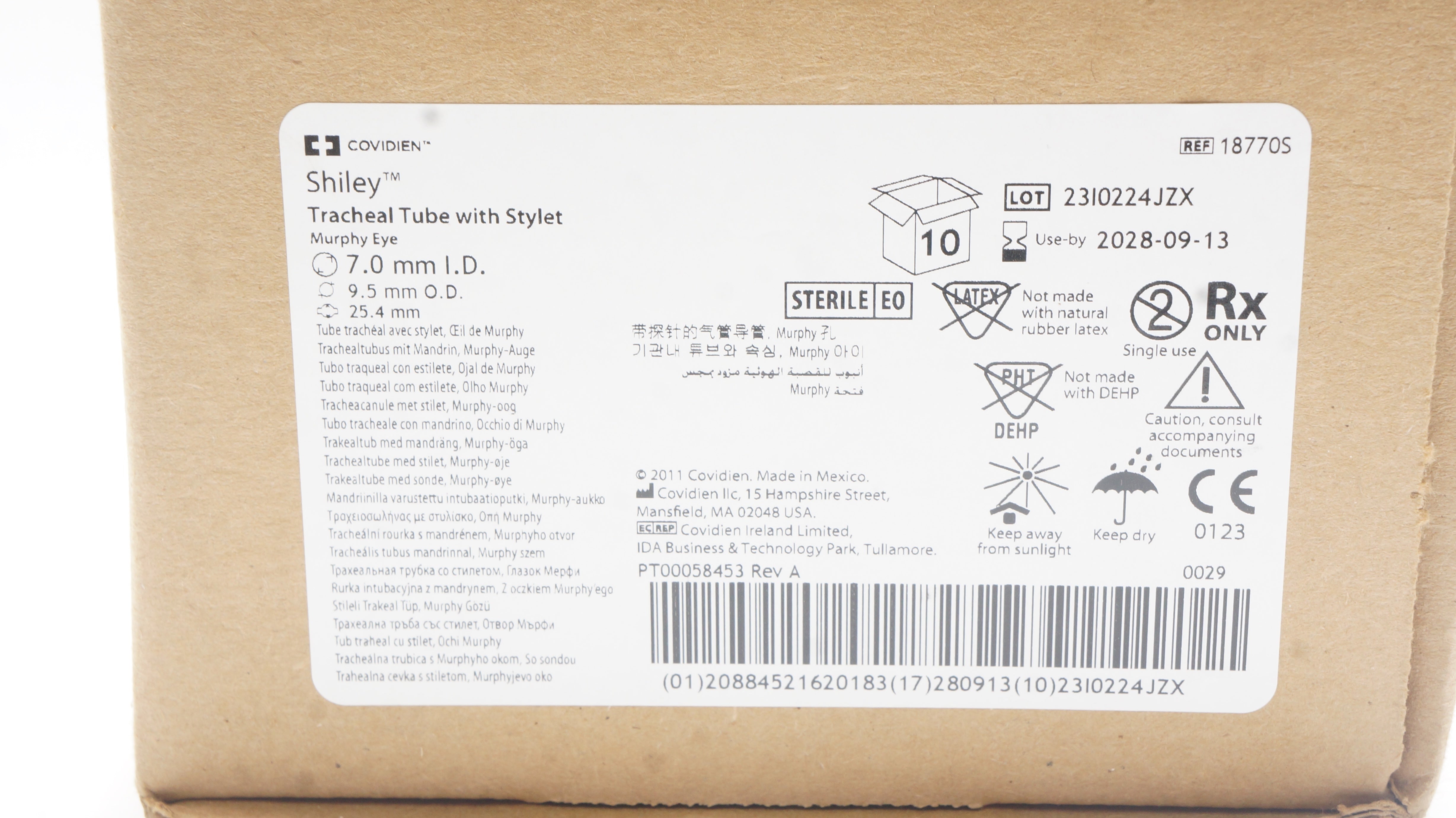 Covidien 18770S Shiley Tracheal Tube With Stylet 7.0mm ID x 9.5mm OD x 25.4mm