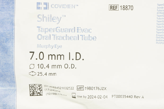 Covidien 18870 Shiley Taper Guard Evac Oral Tracheal Tube 7.0mm x 10.4mm x 25.4mm