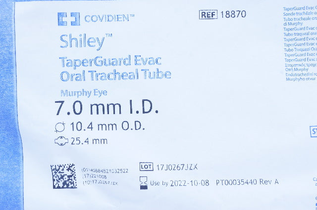 - Covidien 18870 Shiley TaperGuard Evac Oral Tracheal Tube 7.0 x 10.4 x 25.4mm