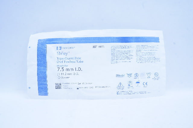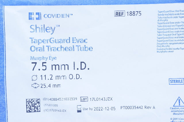 Covidien 18875 Shiley TaperGuard Evac Oral Tracheal Tube 7.5 x 11.2 x 25.4mm