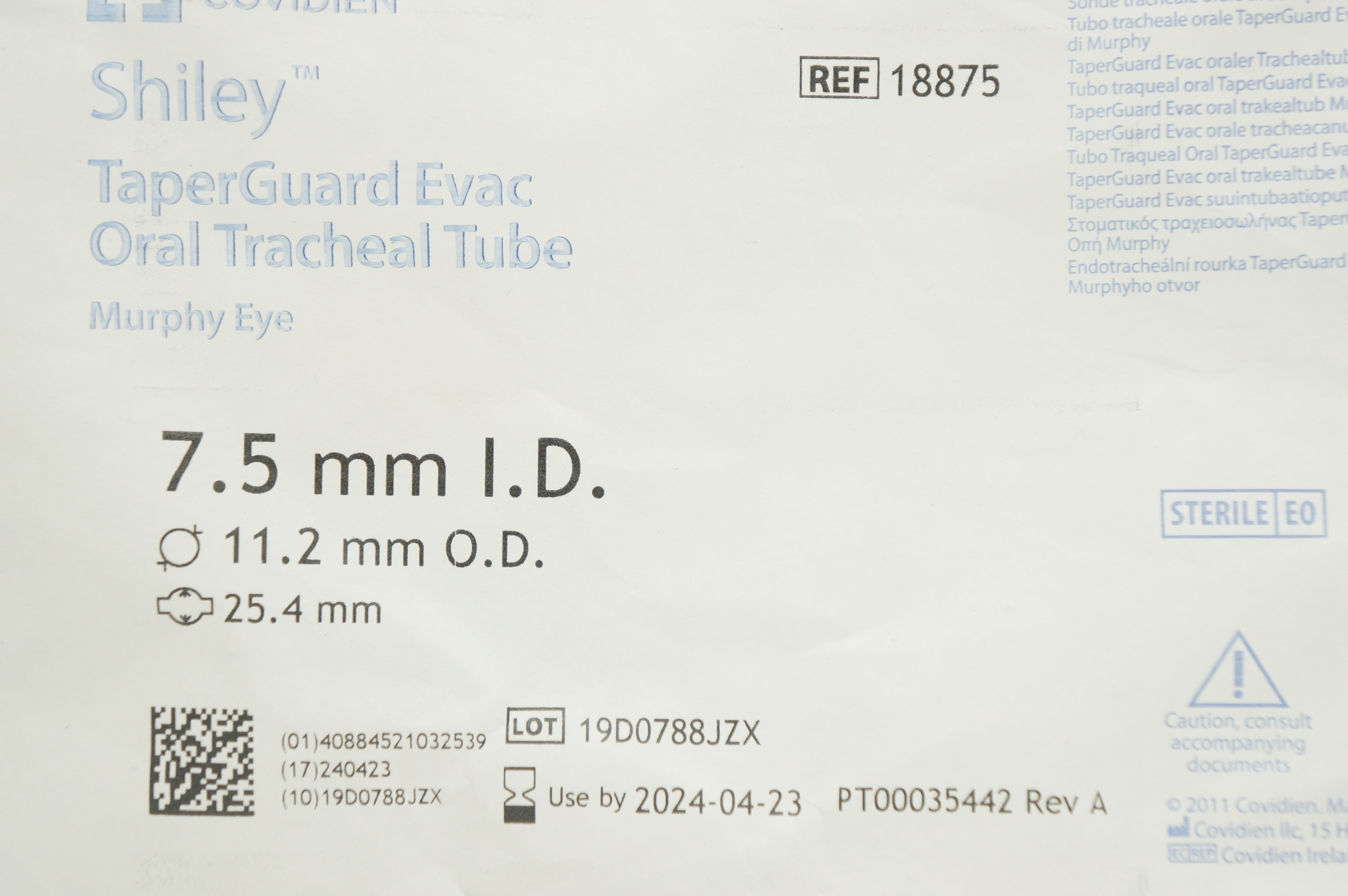 Covidien 18875 Shiley TaperGuard Evac Oral Tracheal Tube 7.5mm x 11.2mm x 25.4mm