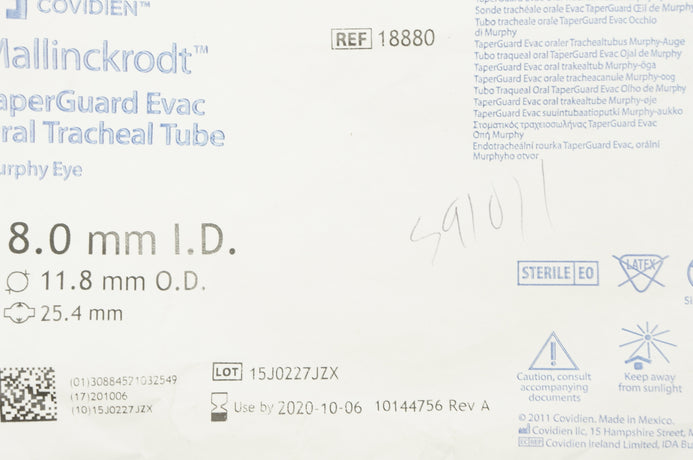 Covidien 18880 Mallinckrodt TaperGuard Evac Oral Tracheal Tube 8.0mm ID x 11.8mm OD
