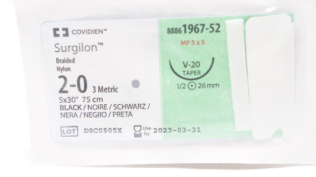 - Covidien 1967-52 2-0 Surgilon Nylon, V-20, 1/2c 26mm Taper, 5 x 30inch (x)