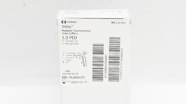 - Covidien 3.0PED Shiley Pediatric Tracheostomy Tube Cuffless 3.0mm ID x 4.5mm OD