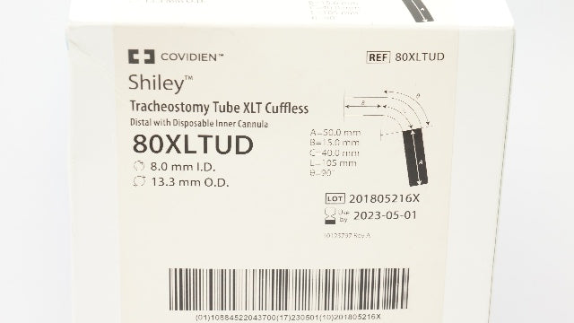 - Covidien 80XLTUD Shiley Tracheostomy Tube XLT Cuffless 8.0mm ID 13.3mm OD (x)
