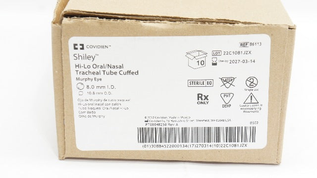 Covidien 86113 Shiley Hi-Lo Oral/Nasal Tracheal Tube Cuffed 8.0x10.8mm-Box of 10