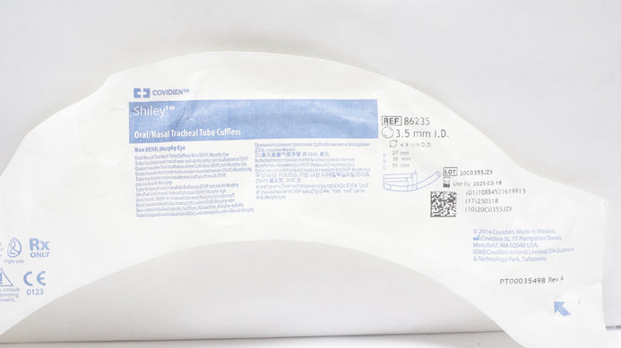 - Covidien 86235 Shiley Oral/Nasal Tracheal Tube Cuffless 3.5mm ID x 4.9mm OD (x)