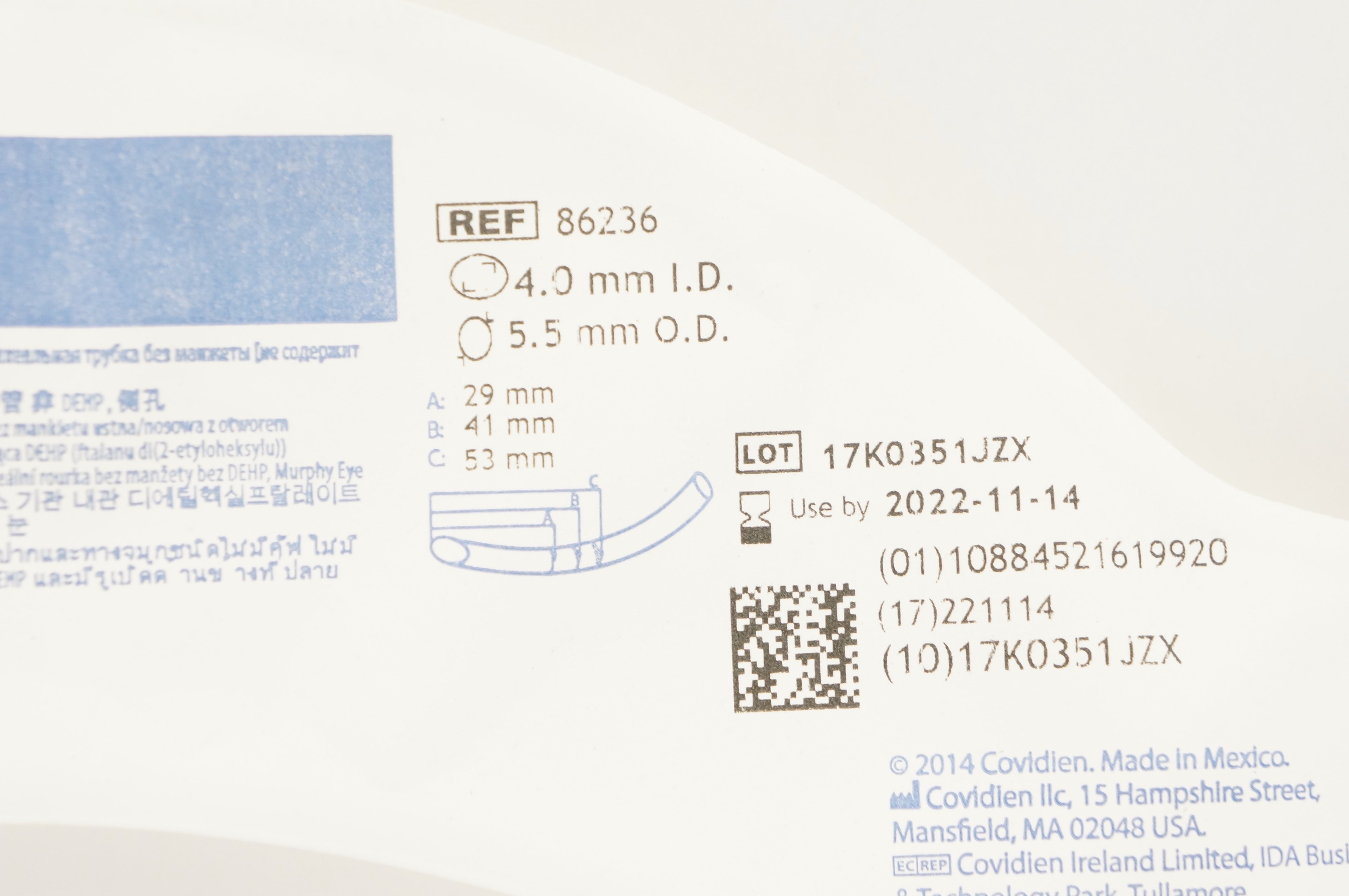 Covidien 86236 Shiley Oral/Nasal Tracheal Tube Cuffless 4.0m ID x 5.5mm OD