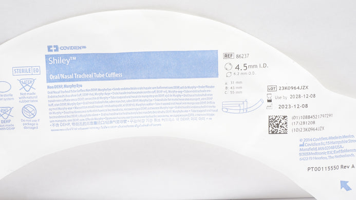 - Covidien 86237 Shiley Oral/Nasal Tracheal Tube Cuffless 4.5mm ID x 6.2mm OD