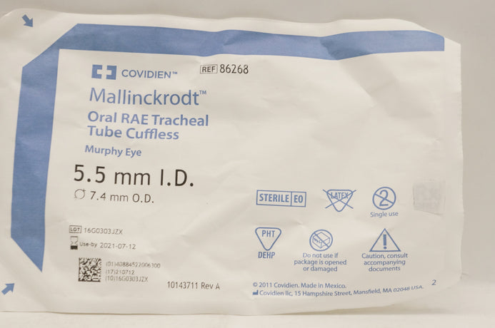 Covidien 86268 Mallinckrodt Oral RAE Preformed Tracheal Tube Cuffless 5.5 x 7.4mm