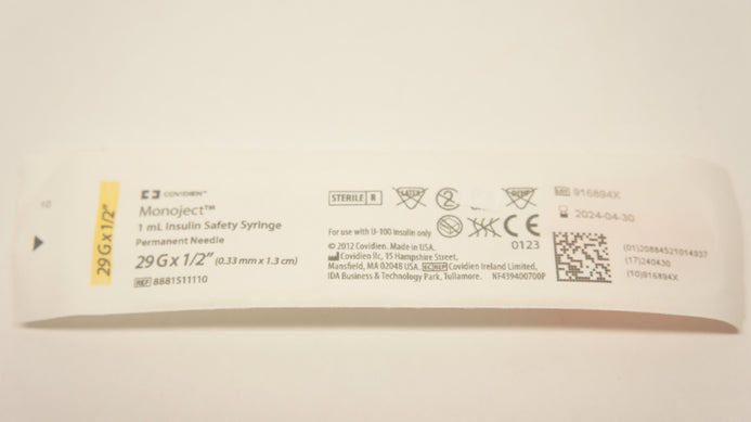 - Covidien 8881511110 Monoject 1 mL Insulin Syringe, Permanent Ndle. 29G x 1/2inch