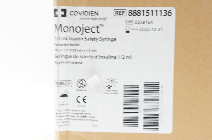 - Covidien 8881511136 1/2ml Insulin Safety Syringe Permanent Needle - Case of 500