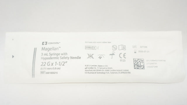 Covidien 8881833215 Magellan 3mL Syringe with Hypodermic Safety Needle 22G x 1-1/2inch