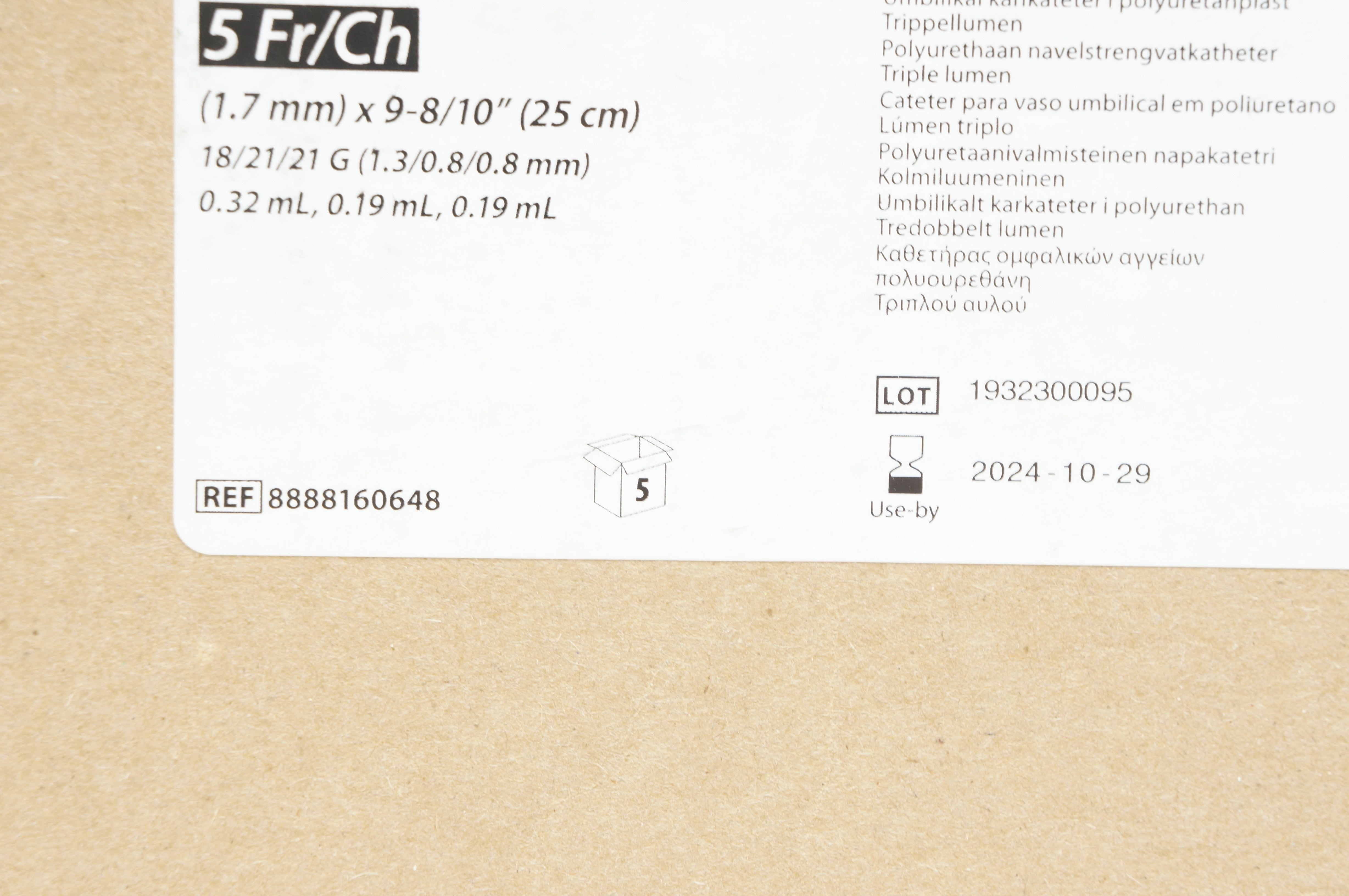 Covidien 8888160648 Polyurethane Umbilical Vessel Cath. 5Fr x 25cm - Box of 5