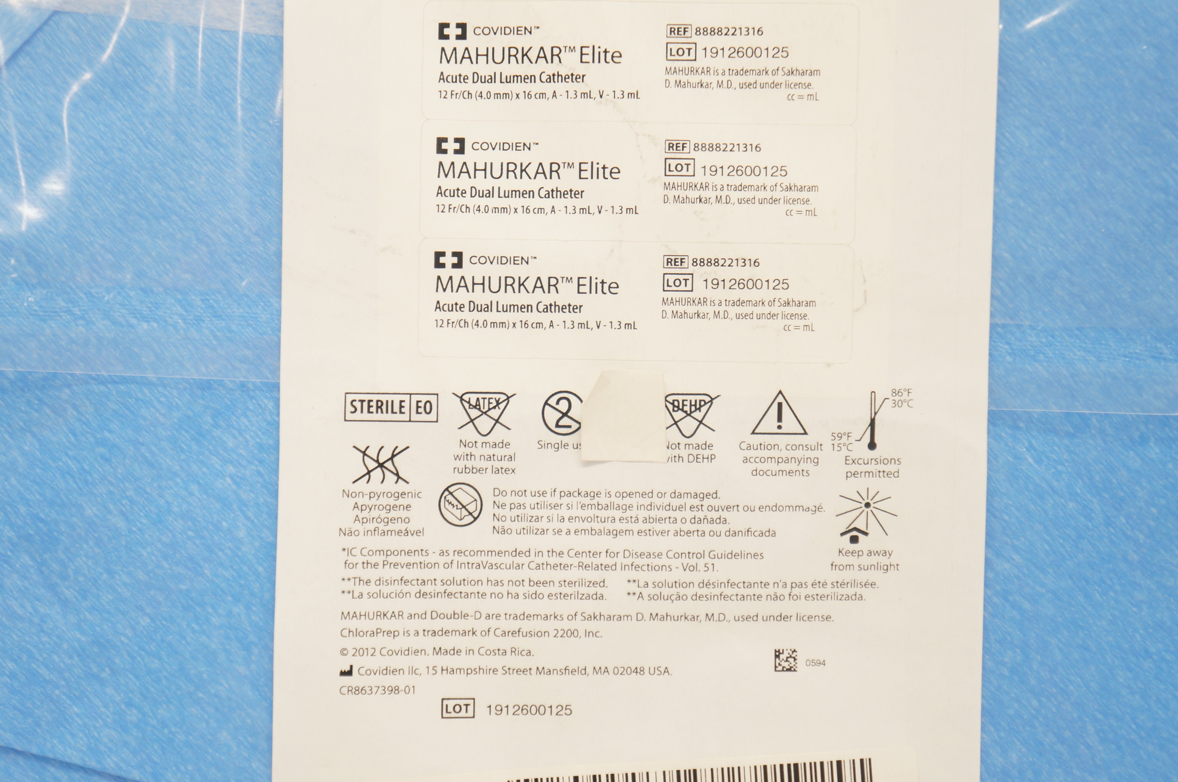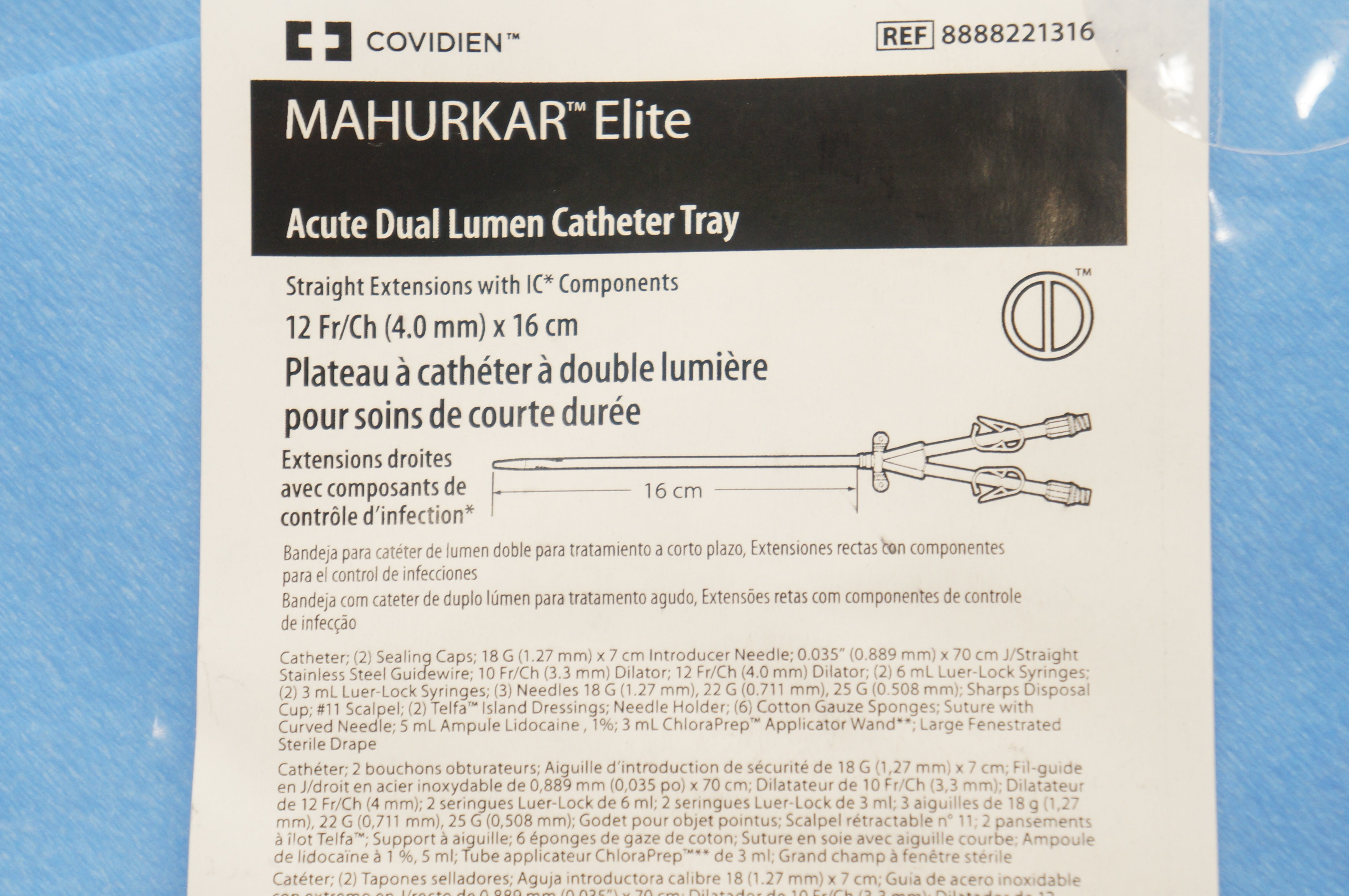 - Covidien 8888221316 Mahurkar Elite Acute Dual Lumen Cath Tray 12Fr x 16cm (x)