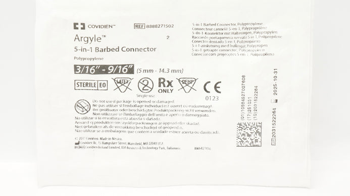 - Covidien 8888271502 Argyle 5-in-1 Barbed Connector 3/16 inch x 9/16 inch