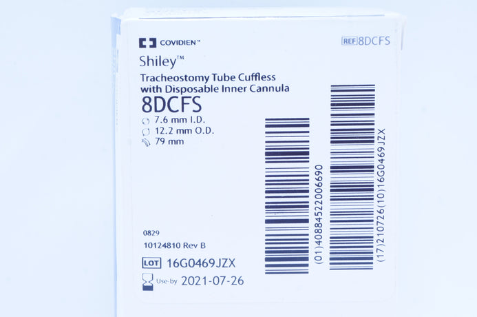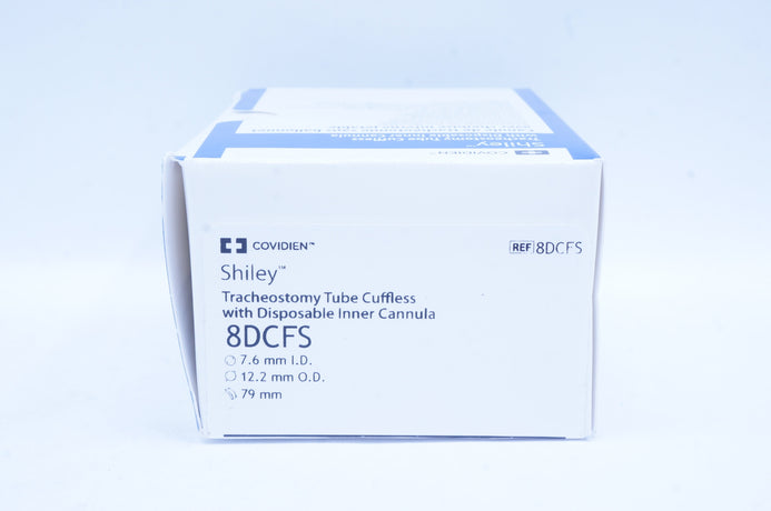 - Covidien 8DCFS Shiley Tracheostomy Tube Cuffless 7.6mm x 12.2mm x 79mm