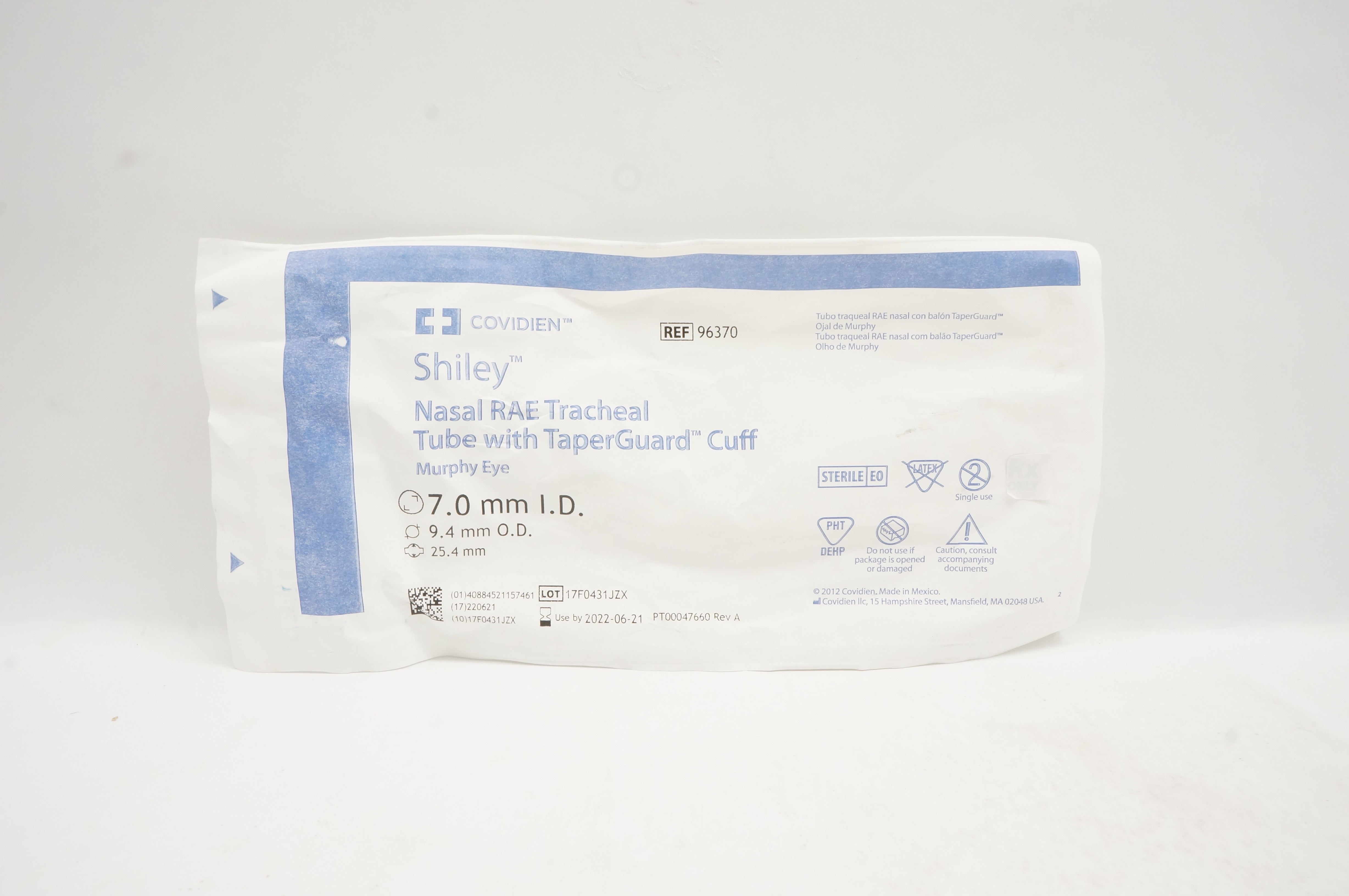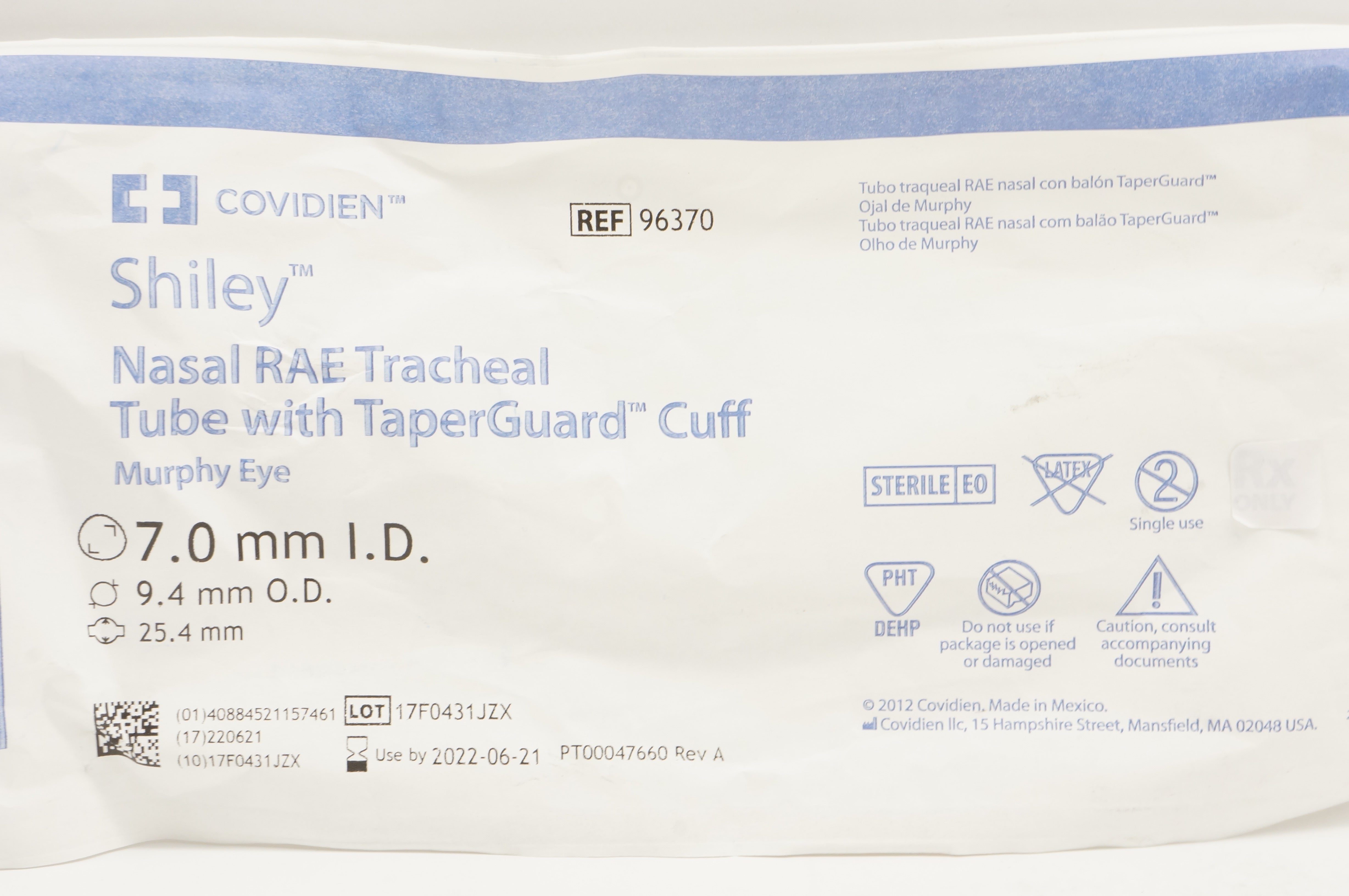 Covidien 96370 Shiley Nasal RAE Tracheal Tube with TaperGuard Cuff Murphy Eye Ø25.4mm, 7.0mm ID 9.4mm OD