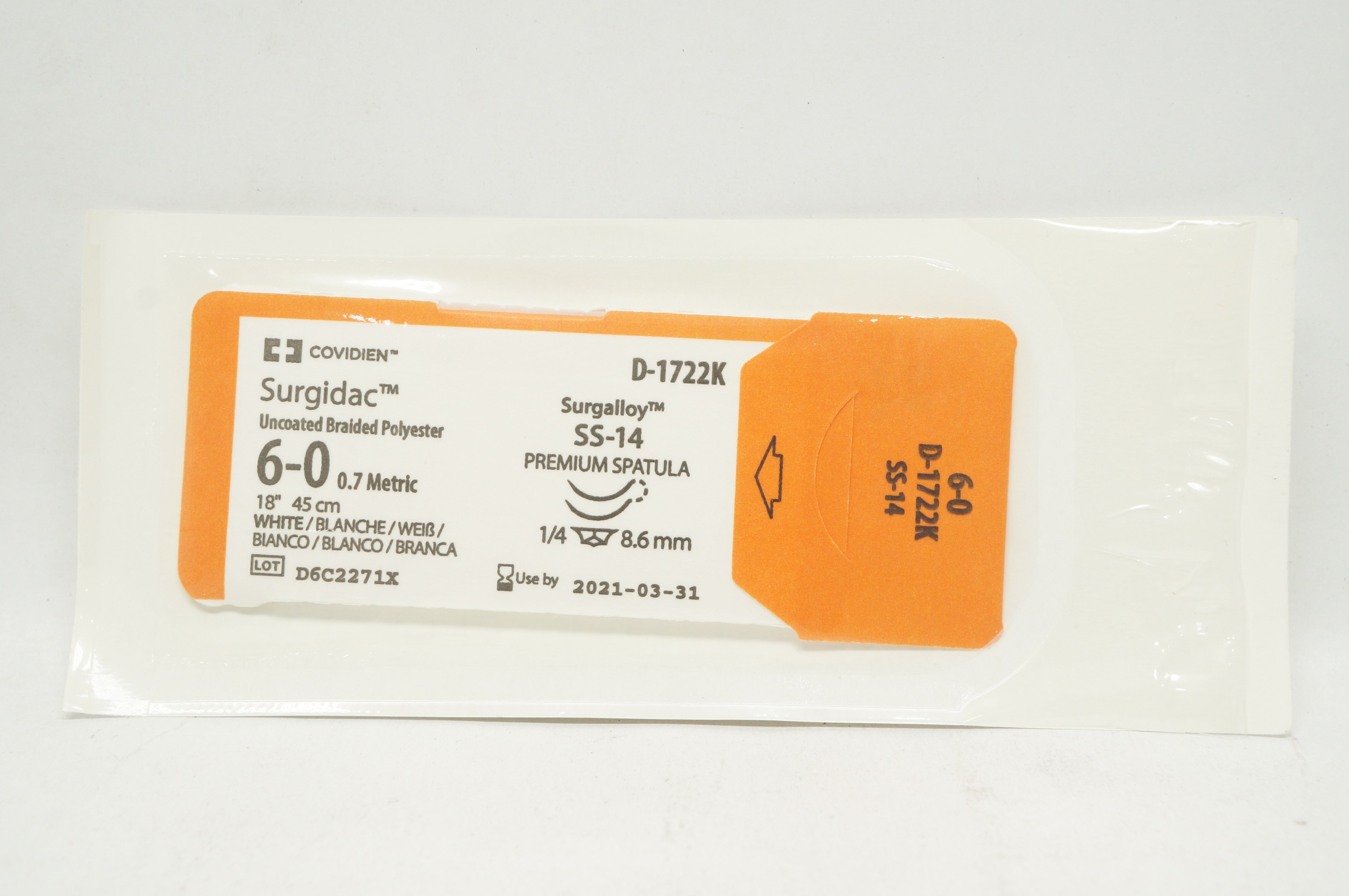 Covidien D-1722K 6-0 Surgidac Uncoated Braided Polyester Suture Surgalloy SS-14 Premium Spatula 1/4 8.6mm, 18inch