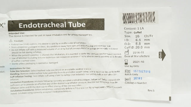 Curaplex 36161 Endotracheal Tube Cuffed 26Ch/Fr 6.5mm ID x 8.8mm OD x 20.0mm (x)