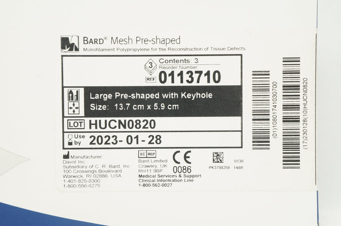 - Davol 0113710 Bard Mesh Large Pre-Shaped W/ Keyhole 13.7cm x 5.9cm - Box of 3
