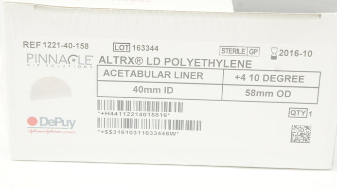 - DePuy 1221-40-158 Pinnacle Polyethylene Acetabular Liner 40mm x +4 10° x 58mm(x)