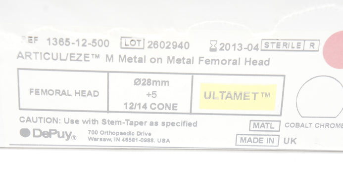- DePuy 1365-12-500 Articul/EZE Metal on Metal Femoral Head 28mm +5 12/14Taper (x)