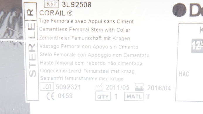 - DePuy 3L92508 Corail Cementless Femoral Stem w/Collar KA18, 12/14 AMT(x)