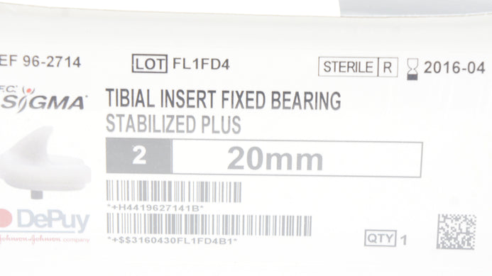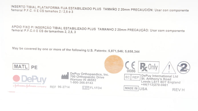 - DePuy 96-2714 Stabilized Plus Tibial Insert 2 x 20mm x 64mm x 43mm (x)