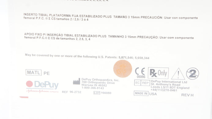DePuy 96-2732 Stabilized Plus Tibial Insert Size 3, 15mm x 71mmM/L x 47mmA/P (x)