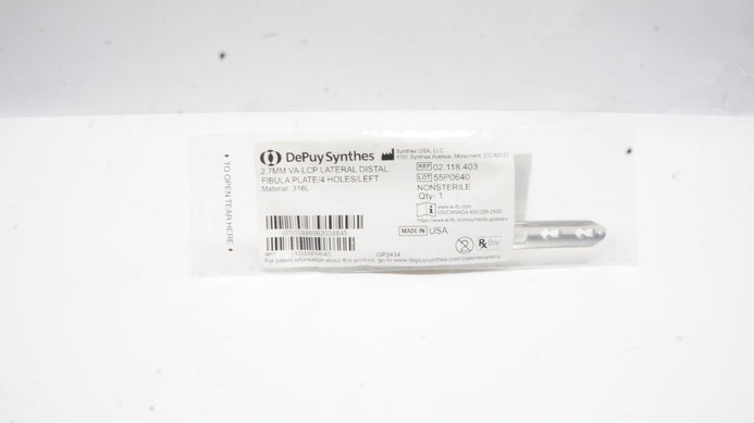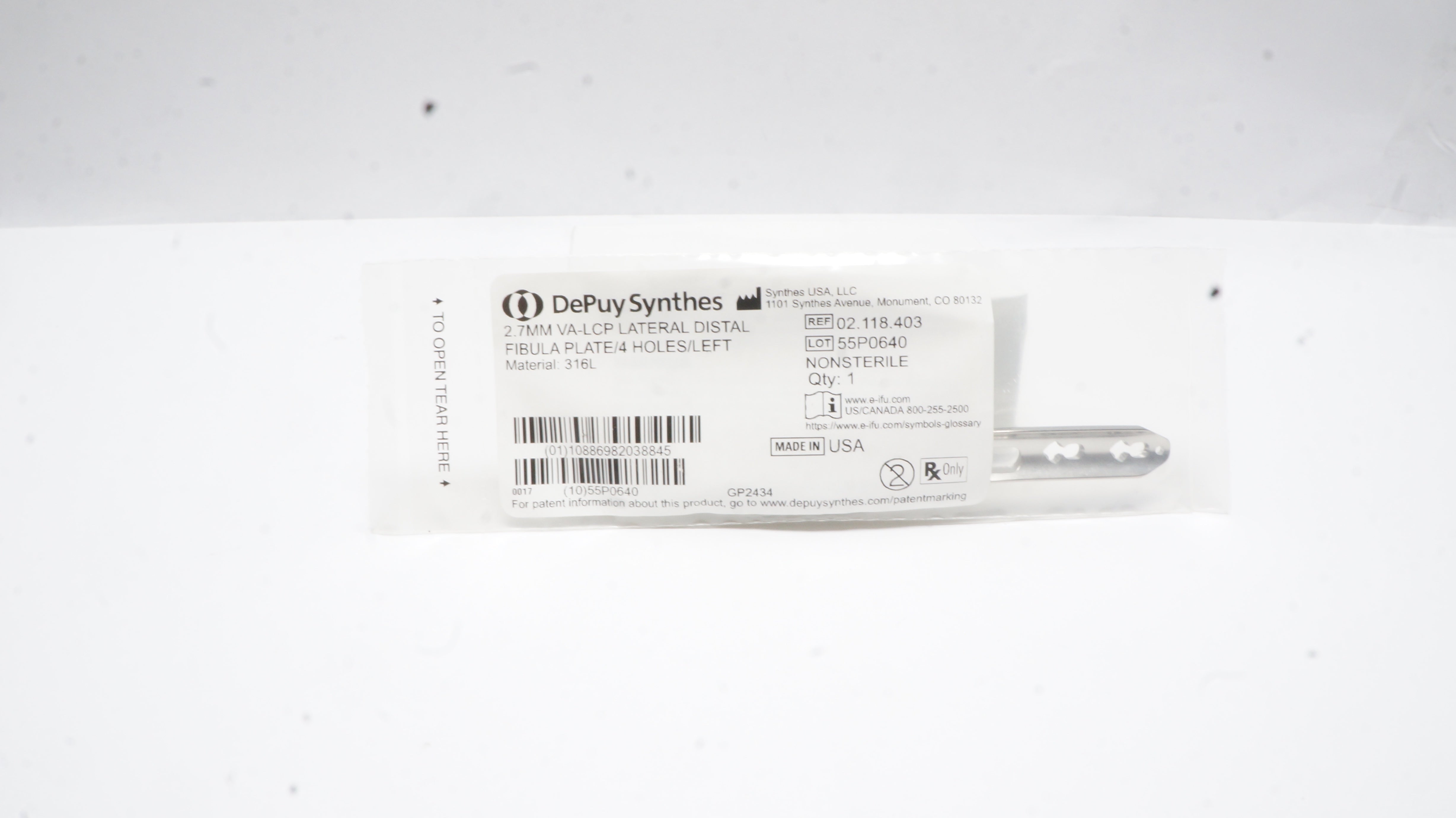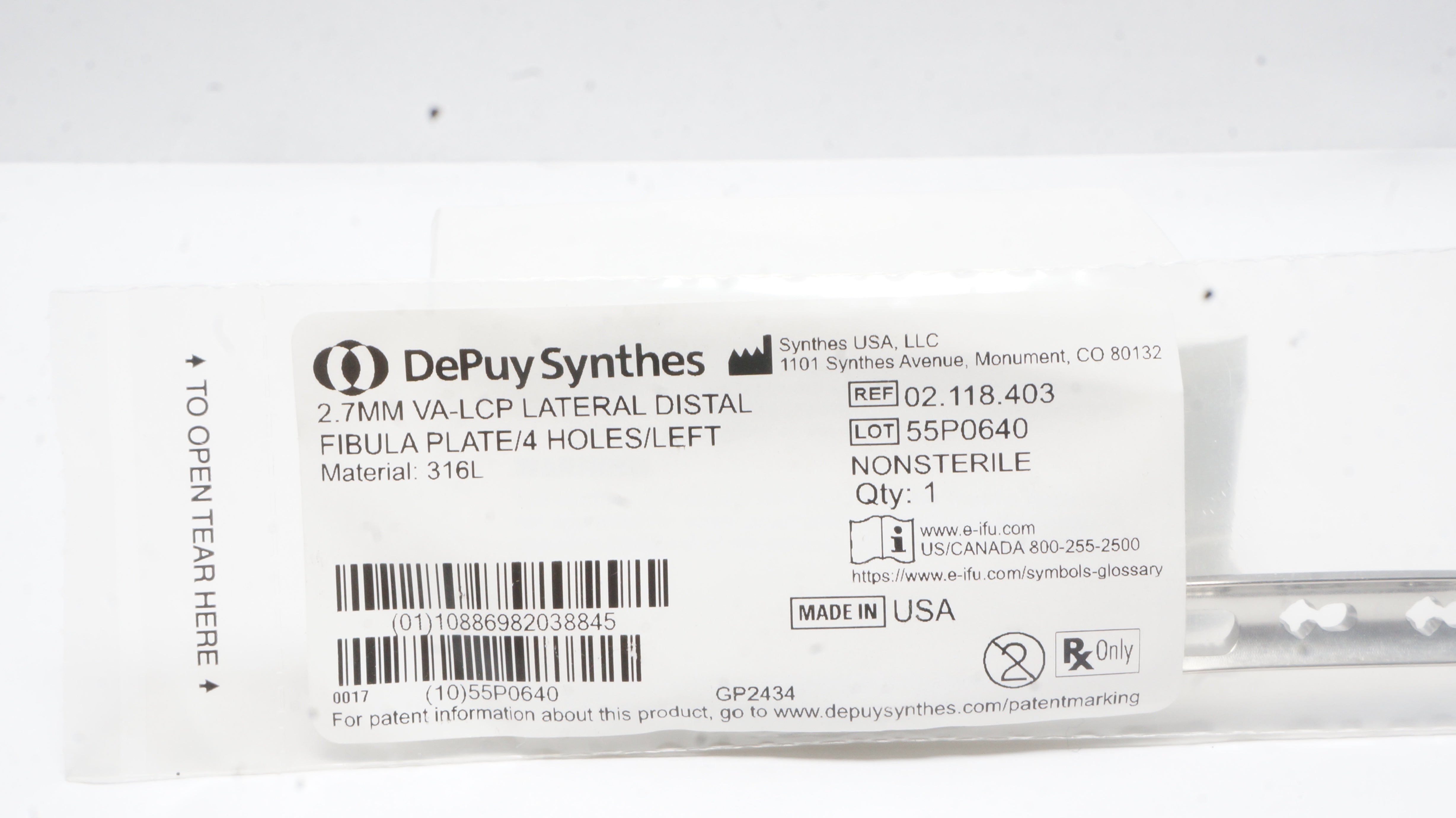 - DePuy Synthes 02.118.403 2.7mm VA-LCP Lateral Distal Fibula Palte/4Holes/Left