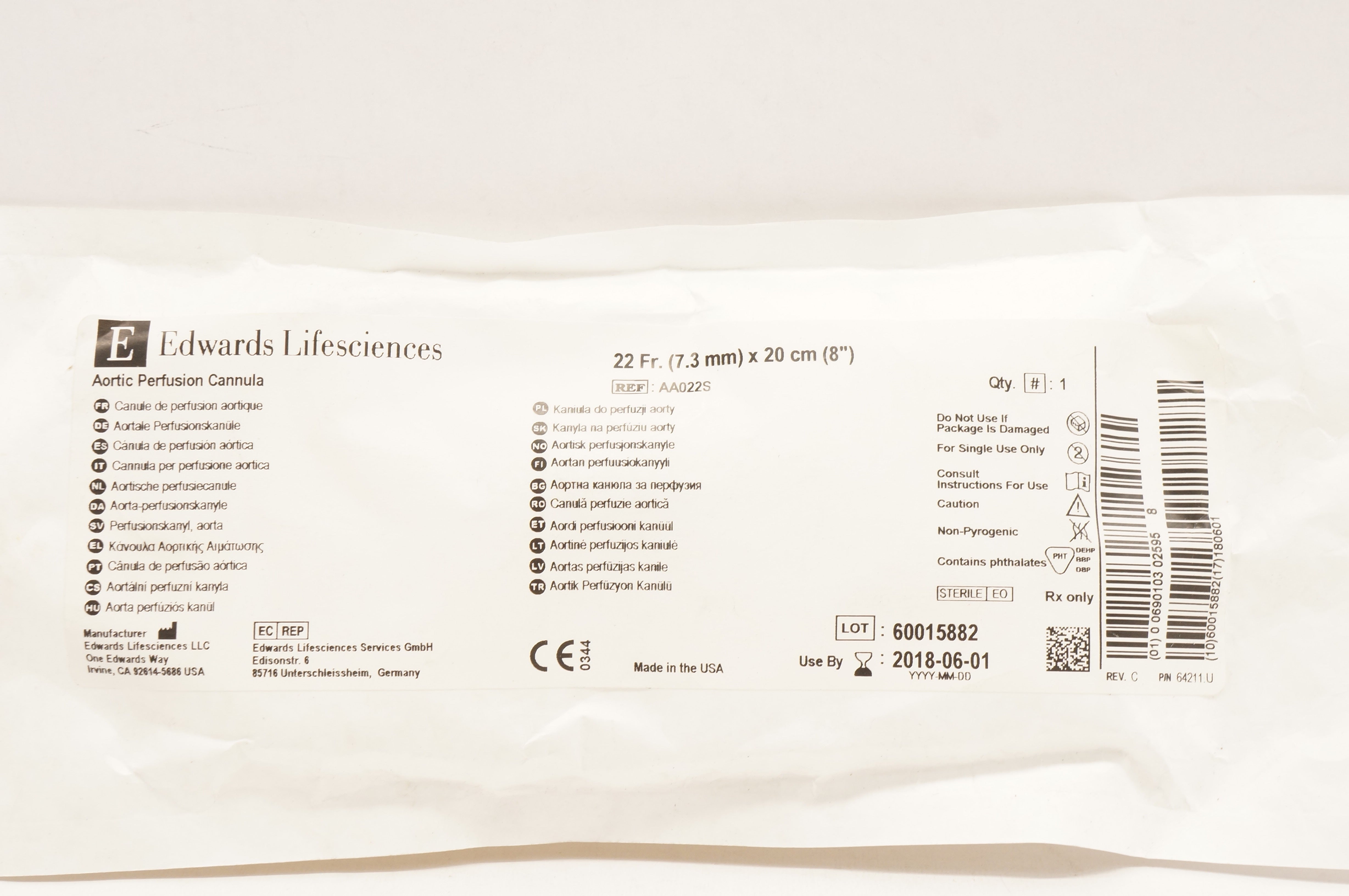 - Edwards Lifesciences AA022S Aortic Perfusion Cannula 22Fr x 8inch (x)