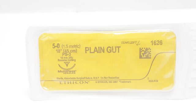 - Ethicon 1626 5-0 Plain Gut Stre PS-3 16mm 3/8c Reverse Cutting, 18inch (x)