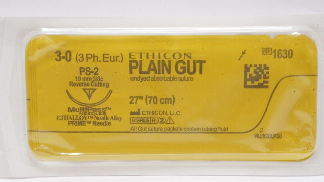 - Ethicon 1630 3-0 Plain Gut Undyed Stre PS-2 19mm 3/8c Reverse Cutting, 27inch(x)
