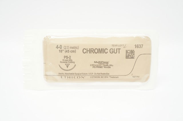 - Ethicon 1637 4-0 CHROMIC GUT Surgical PS-2 19mm 3/8c Reverse Cutting, 18inch (x)