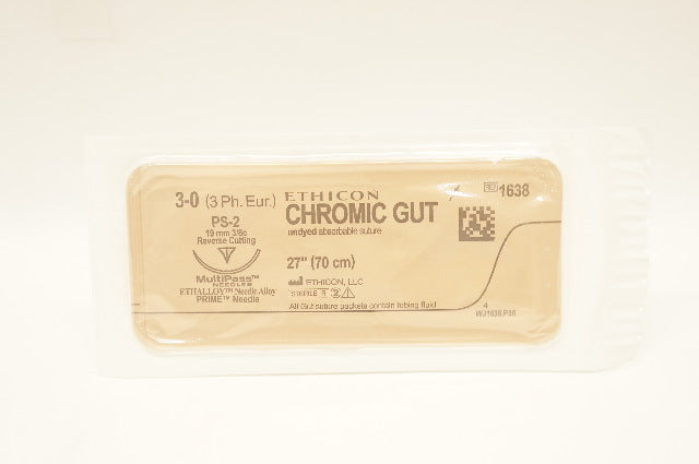 Ethicon 1638 3-0 Chromic Gut Undyed Stre PS-2 19mm 3/8c Reverse Cutting 27inch