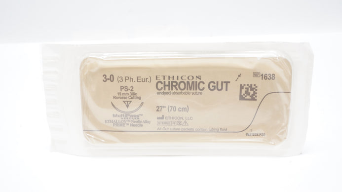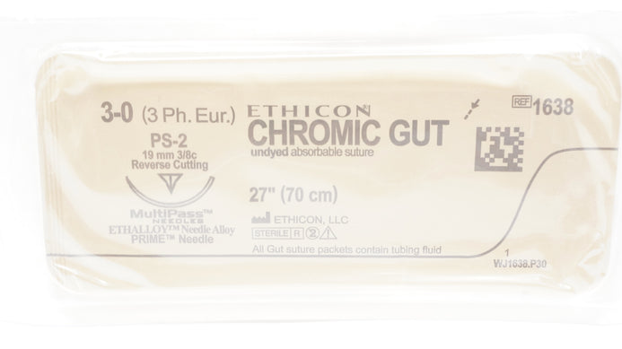 - Ethicon 1638 3-0 Chromic Gut Undyed Stre PS-2 19mm 3/8c Reverse Cutting 27inch
