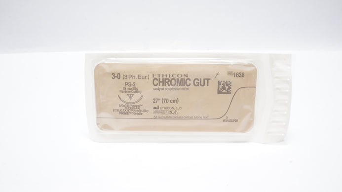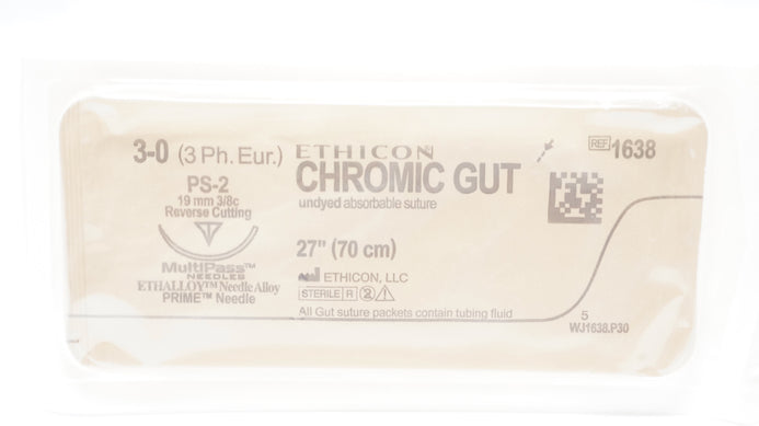 - Ethicon 1638 3-0 Chromic Gut Undyed Stre PS-2 19mm 3/8c Reverse Cutting 27inch