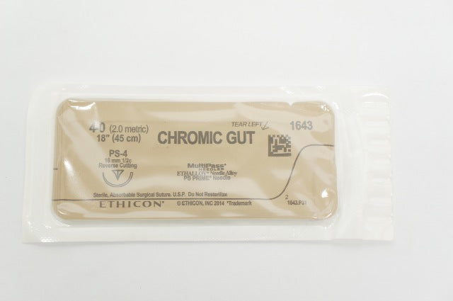 - Ethicon 1643 4-0 CHROMIC GUT, PS-4, 16mm 1/2c Reverse Cutting, 18inch