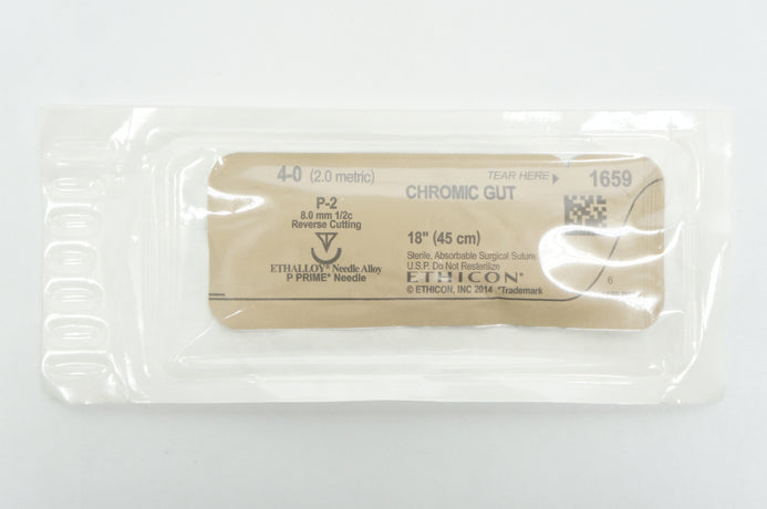 - Ethicon 1659 4-0 CHROMIC GUT, P-2, 8.0mm 1/2c Reverse Cutting, 18inch