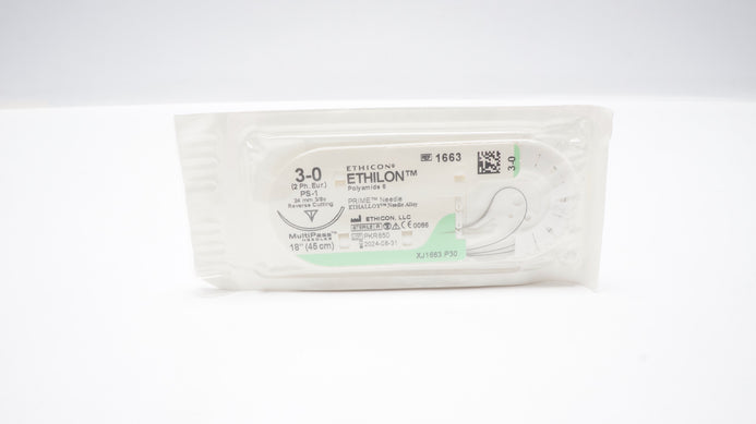 Ethicon 1663 3-0 Ethilon Nylon Suture Black Monofilament PS-1 24 mm 3/8c Reverse Cutting 18 inch