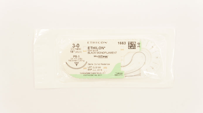 Ethicon 1663 3-0 Ethilon Nylon Suture Black Monofilament PS-1, 24mm 3/8c Reverse Cutting, 18inch