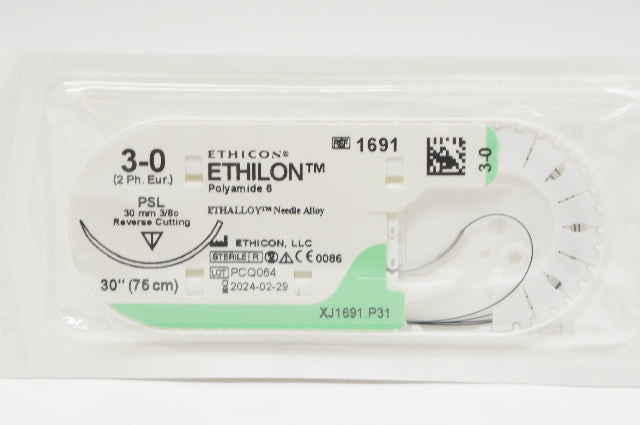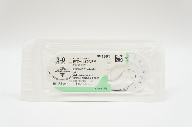 Ethicon 1691 3-0 ETHILON, PSL, 30mm 3/8c Reverse Cutting, 30inch