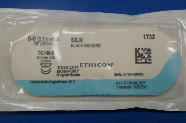 Ethicon 1732 SILK, TG140-8 6.5mm 3/8c Spatula, Black Braided, 18", Size 6-0