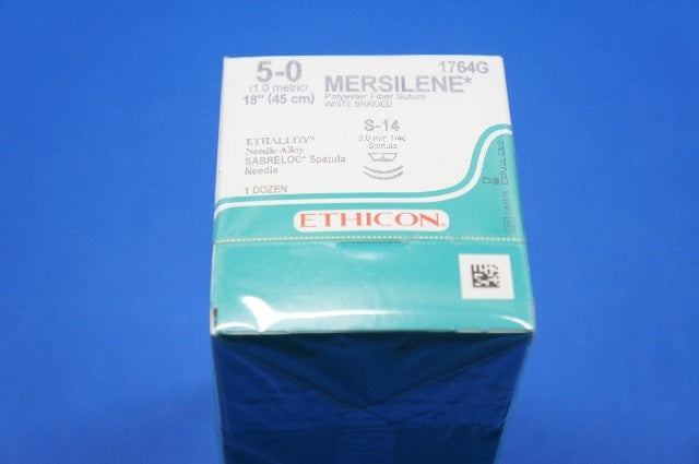 Ethicon 1764G MERSILENE Suture, SABRELOC - Spatula, Non-Absorbable, S-24 8.0mm / S-24 ¼ Circle, White Braided 18" ˜ 45cm, Size: 5-0
