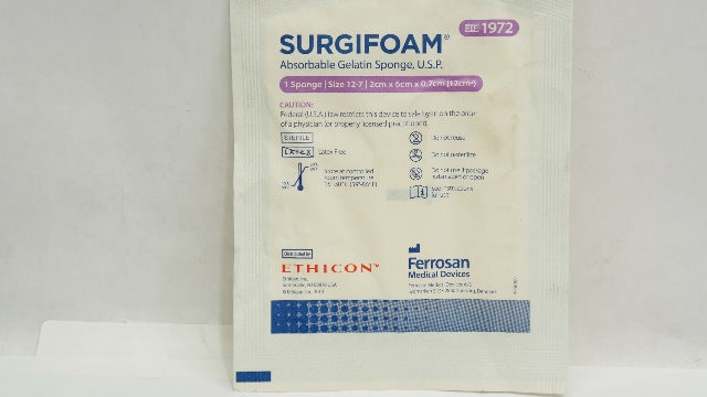 Ethicon 1972 SURGIFOAM Absorbable Gelatin Sponge, USP Size 12-7, 2 x 6cm x 0.7cm