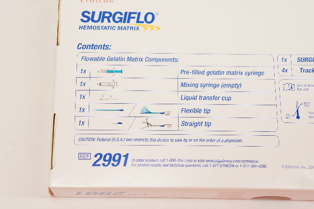 The Ethicon 2991 SURGIFLO Hemostatic Matrix is a medical product used to control bleeding during surgical procedures. It is a sterile, absorbable hemostatic matrix that consists of bovine collagen and thrombin, which work together to promote clotting and hemostasis.
