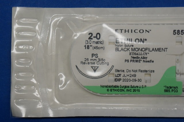 - Ethicon 585 2-0 ETHILON, PS 26mm 3/8c Reverse Cutting, Black Monofilament, 18