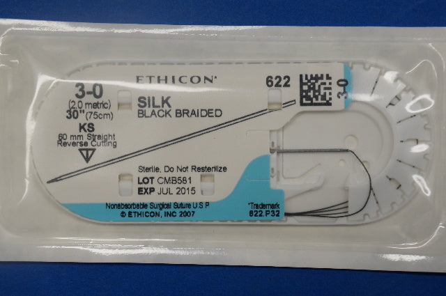 Ethicon 622 3-0 SILK, KS 60mm Straight Reverse Cutting, Black Braided, 30