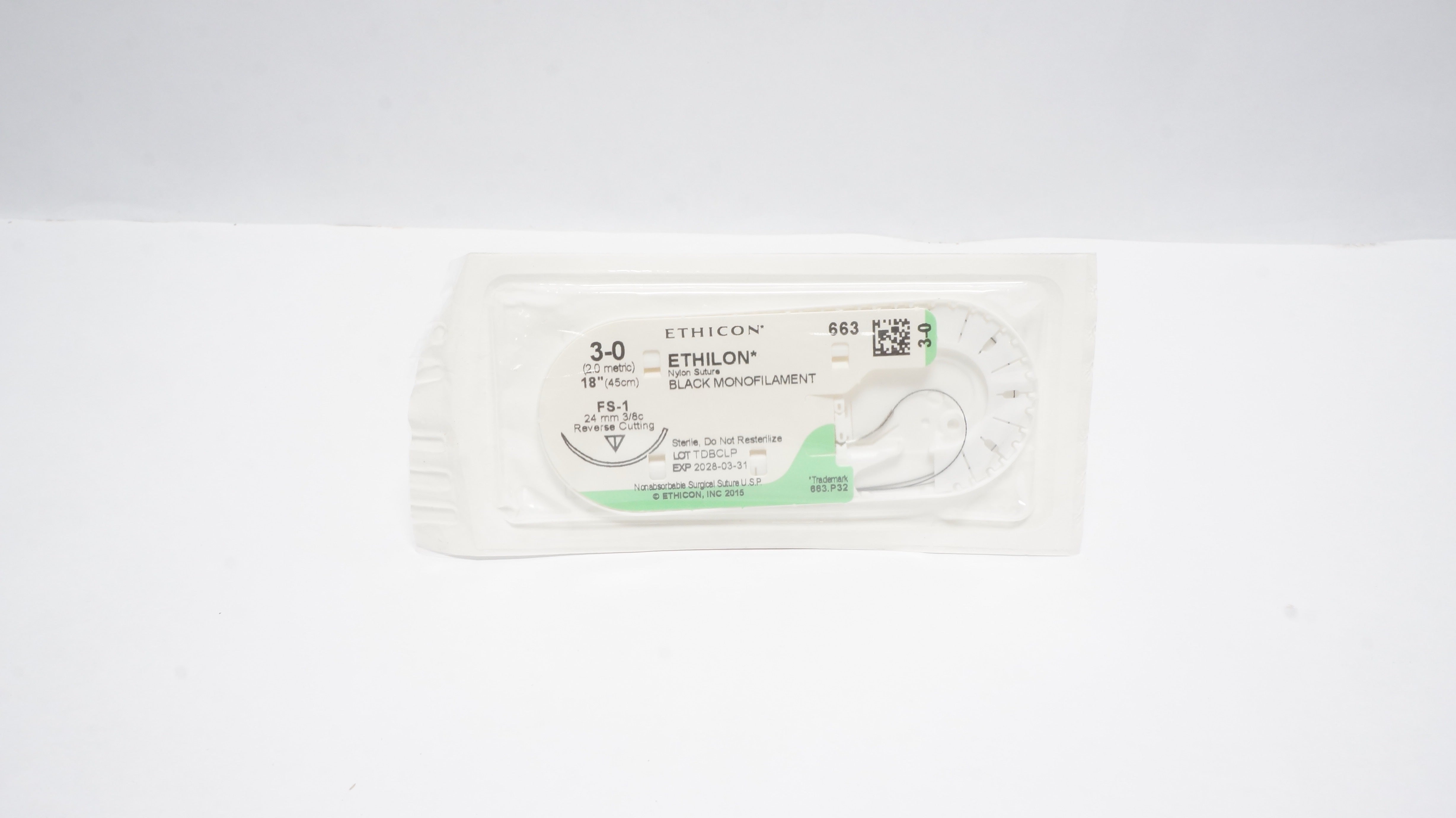 - Ethicon 663 3-0 Ethilon Nylon Stre FS-1 24mm 3/8c Reverse Cutting 18inch